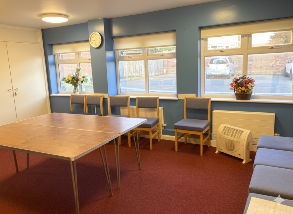 1 x small size MEETING ROOM, (overlooking the church sanctuary) quiet, carpeted, central heating, adjacent disabled toilet, upstairs.