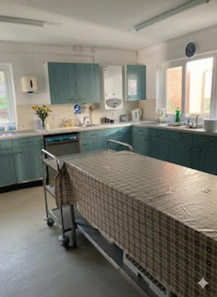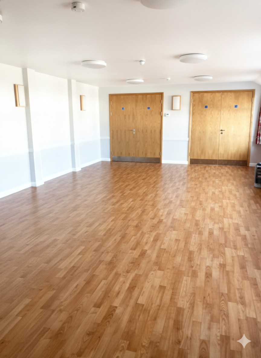 1 x large MAIN HALL, with parquet flooring, pre-programmed central heating, kitchen adjacent with serving hatch, stacking chairs and tables. Ground floor.